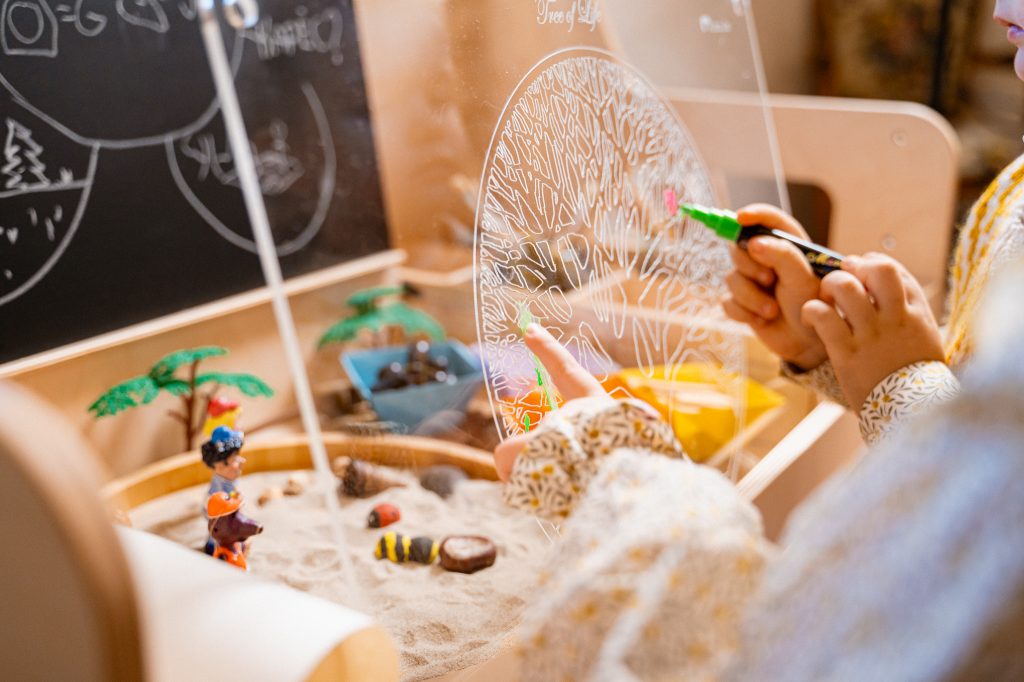 The acrylic board lets the child add everything that belongs “in the air” or “above the scene.”