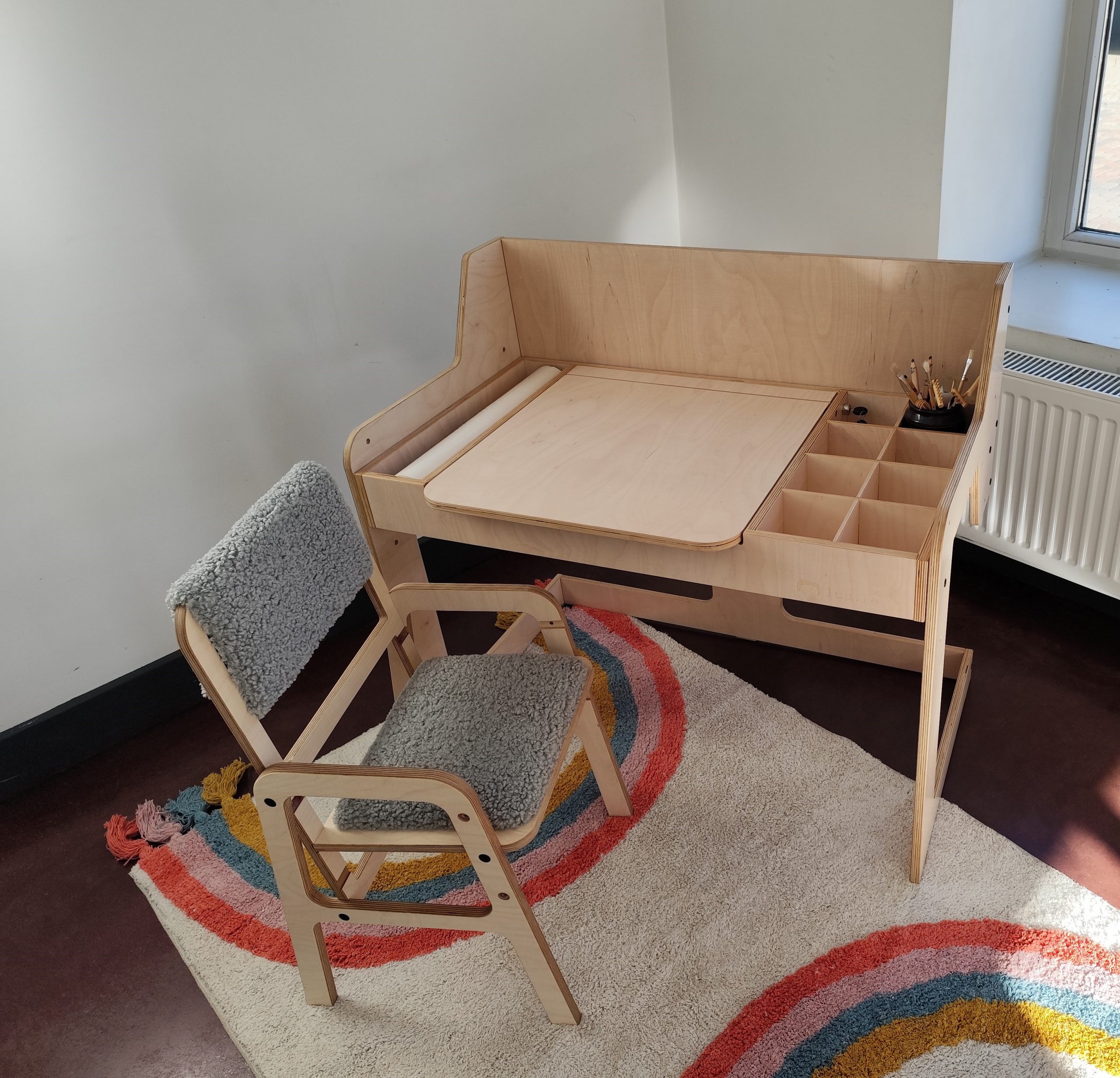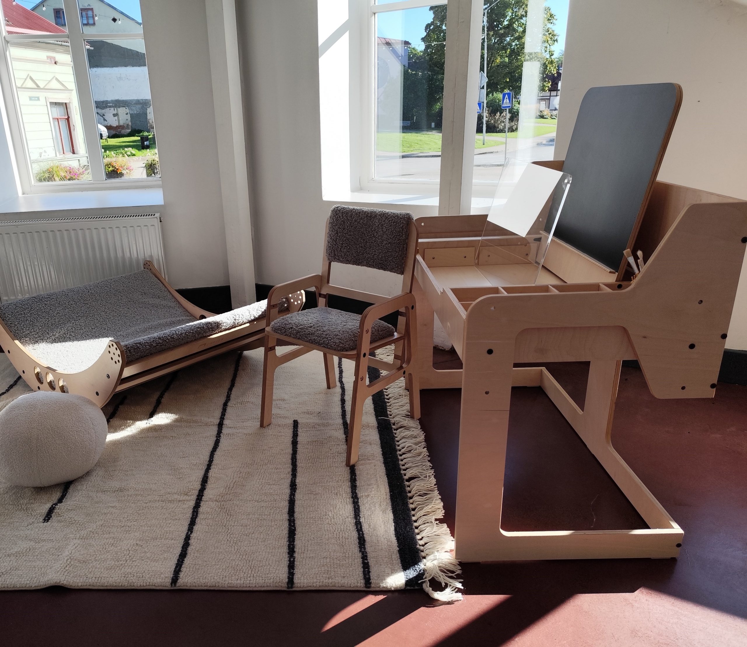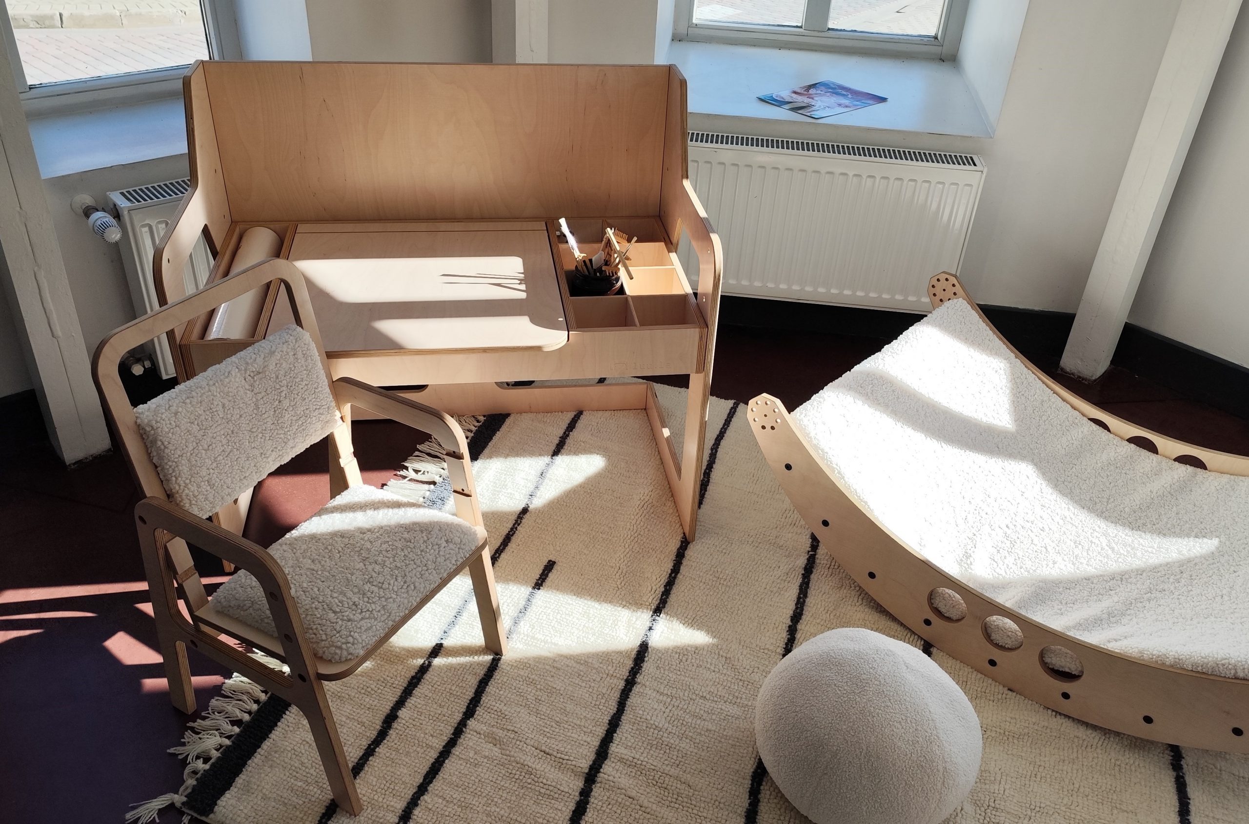 When it's raining and the child's time is tooo long, but yours - to short, open the gateway to a dream adventure! Luula Table Set is designed for learning or just playing. The set has an adjustable height, which will allow it to be used from the time the child begins to sit independently at the table until adolescence. It's given for your child his first individual place where the children can arrange his inner world and be creative in many ways. The table will make the work of development specialists easier and will free your child from screens at home!